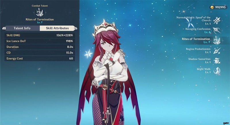 その後、できるだけ早くエレメンタル アンリーシング Rites of Termination をキャストします。 .ロザリアが槍を地面に突き刺し、8 秒間、エリア クライオ ダメージを与える。 影のサマリア人 パッシブは、すべてのキャラクター (ロザリアを除く) に 10 秒間、ロザリアのクリティカル率の 15% のクリティカル率ボーナスを付与します (これは彼女のエレメンタル攻撃バフを考慮に入れます)。これにより、彼女をサポートとしてプレイすると、彼女はあなたのチームを後押しし、Cryo 要素を適用できるようになります。