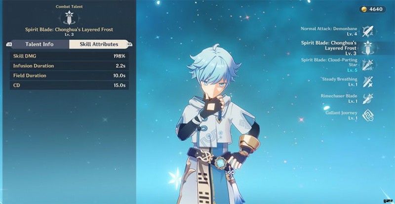 チョンユンは非常に優れたメイン DPS です .彼はエレメンタル攻撃スピリット ブレイド:Chonghua's Layered Frostのおかげで、すべてのスキルを使って Cryo 攻撃を実行できるようになります。 .これにより、10秒間残る霜のフィールドが生成されます。 クライオの属性です 両手剣、片手剣、または速攻武器を装備したキャラクターの通常攻撃とチャージ攻撃のダメージに要素を追加します。エリアがなくなると、エンチャントはさらに 2 秒間持続します。