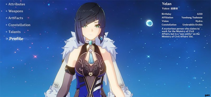 Yelan は Liyue Civil Affairs Bureau で働いていると思われる謎の若い女性です。