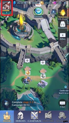 コール オブ アンティア ギフト コードの有効化 は非常に簡単です。開始するには、ゲーム、より正確には Kingdom に移動します タブ。次に、画面の左上隅にあるアバターの肖像画を押します。これにより、あなたのプロフィールが表示されます。