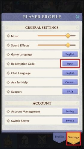設定をクリックします 画面下部のタブ。一般設定に入ると、最終的にコール オブ アンティア クーポンを引き換えるメニューが表示されます。 報酬のために。 コードを入力を押してください ボタン。