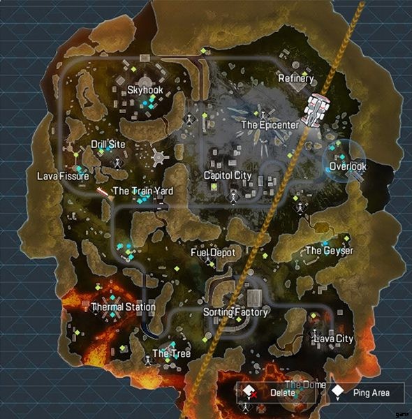 Apex Legends のランディング スポットについて話し合う最後のトピックが 1 つあります。各ゲームの開始時に、ランダム スポット 地図上に青い丸で示されています。このマーカーは、高品質の戦利品であることを示しています 完全装備の武器を見つける可能性と同様に、その場所で利用可能です