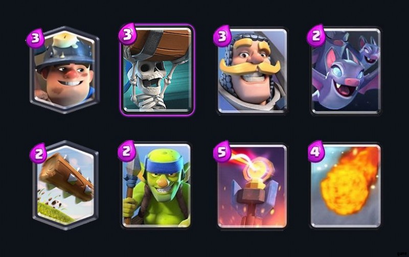 まず、最高のクラッシュ ロワイヤル アリーナ 6 デッキを理解することが重要です。 スパム用に作られています。確かに、アグレッシブなデッキです 非常に低いエリクサーコストで。名前が示すように、このデッキのメイン コンボはマイナーとウォール ブレイカーのカードに依存します。 .戦闘開始時から、フォーマーをできるだけ敵のタワーに近づけます。