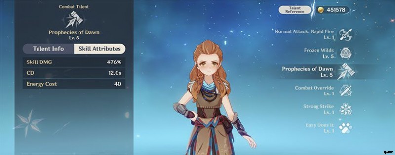 彼女の夜明けの予言を発動する絶好の機会です エレメンタル大暴れ。アーロイが矢を放ち、大きなダメージ エリア クライオを発生させます。この能力は 40 エレメンタル エネルギー ポイントしか必要としないため、定期的に唱えることができます。