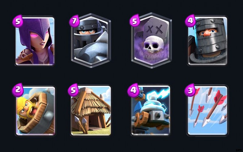 その主な利点は、その汎用性です 、このカードは地上ユニットを攻撃し、敵の前進を遅くするスケルトンを生成するため、魔女は遠隔ダメージを与えます.ただし、範囲ダメージ スケルトンが現れたらすぐに一掃でき、ウィッチはあまり抵抗力がありません。