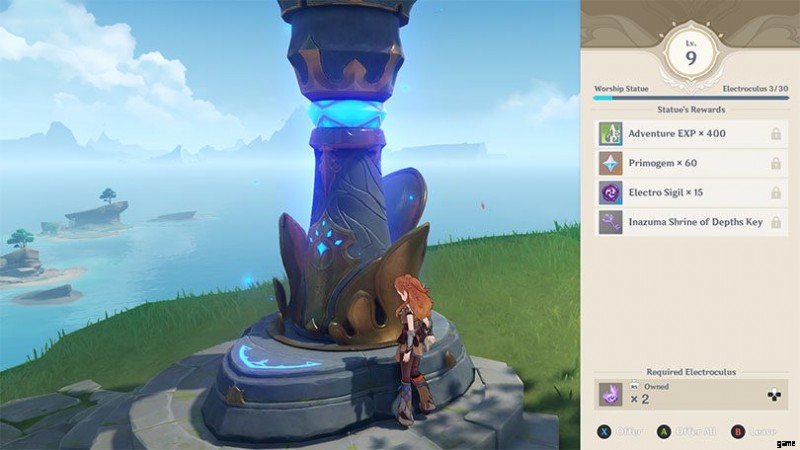それらを集めることで、スタチュー オブ ザ セブン (イナズマ) の 10 レベルを完了することができます。 .これを行うには、適切な数の Electroculus を取得したら、イナズマに拠点を置くセブンの像とやり取りできます。