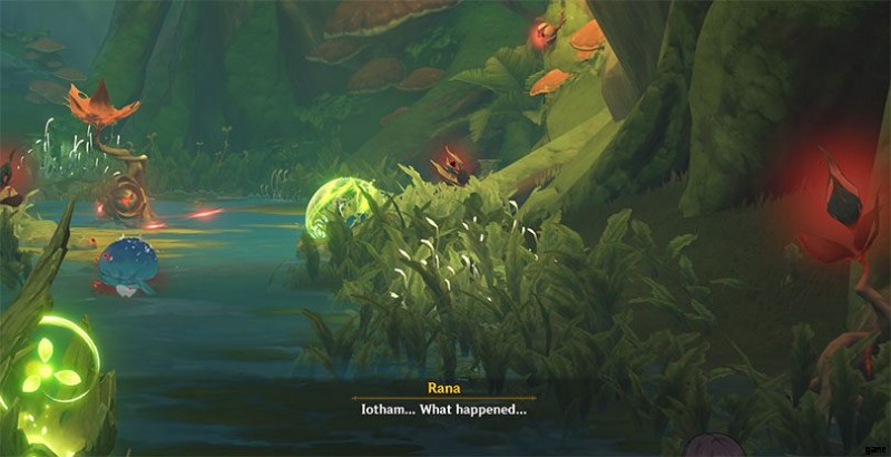 それまでの間、いくつかの奇妙な緑色のトラックをたどって、ラナを探しに行きます. ラナのキャンプへご案内します .彼女はイオサムがいたのと同じようなデンドロ球体で意識を失っています。これは実際にはアララカラリです 、マラナによって引き起こされた腐敗から内部の誰もを保護する魔法の保護バブル 、乾燥地帯を作り出す悪。