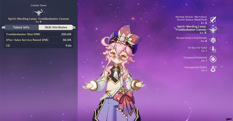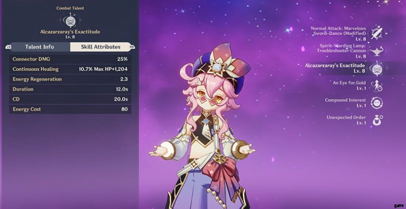 秘訣は、ゲームプレイをエレメンタルの解放に向けることです:アルカサルザライの正確さ .ドーリは彼のランプのジンを召喚します。これはフィールドに12秒間留まります。次に、彼とアクティブなキャラクターとの間にリンクを作成します。それ以降、キャラクターはヒーリング、エレメンタル エネルギーを取得し、エレクトロ エレメントの影響を受けます。敵にエレクトロ要素を適用するには、アクティブなキャラクターとジンの間のリンクがそれに触れる必要があり、不便な場合があります.