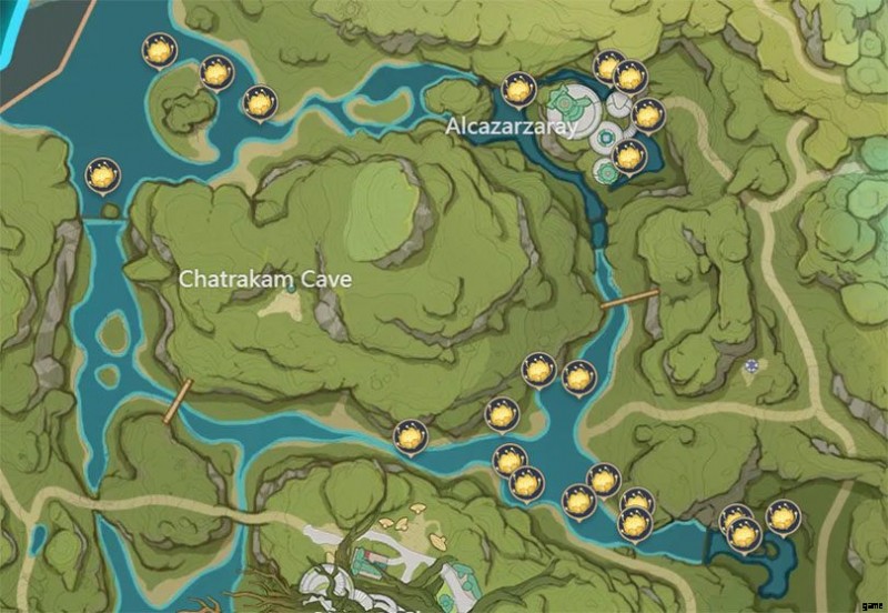 5 つは アルカサルサライ宮殿 を囲む川にあります チャートラカム洞窟のすぐ上、左側に 4 つ .次に東に下ります。 Sumeru の町のすぐ上の川で 12 匹の Nilotpala Lotus があなたを待っています。
