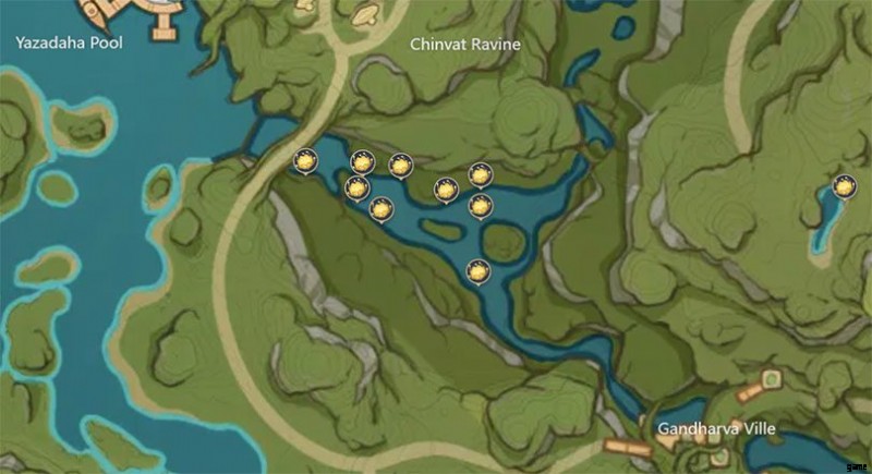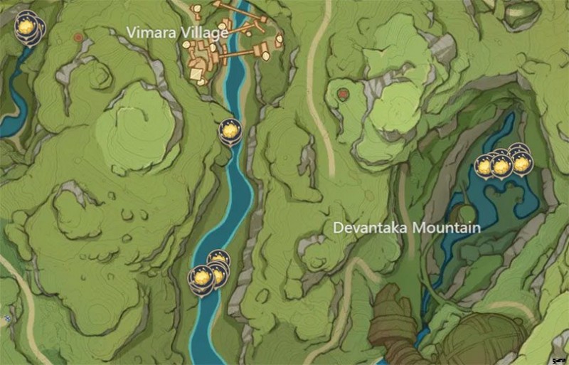 Genshin Impact Nilotpala Lotus の次の農場エリアは、Vimara 村に移動します .小川を下ると、10個の花を集めることができます。 デバンタカ山を囲む小川にも7つのロータスが隠されています .