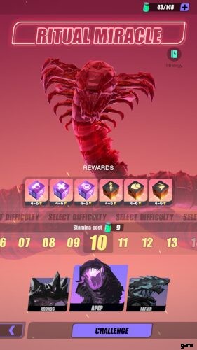 ディスライト アペップ 10 風属性の蛇です。彼の戦略は、毒デバフをチームに適用することです それらを爆破する前に。 Ritual Miracleのすべてのボスと同じように 、彼は2つのタブレットが付属しています。 1 つは毒に苦しむ敵を気絶させる能力を持つ範囲攻撃を実行し、もう 1 つは人を傷つけ、すべてのバフを取り除きます。