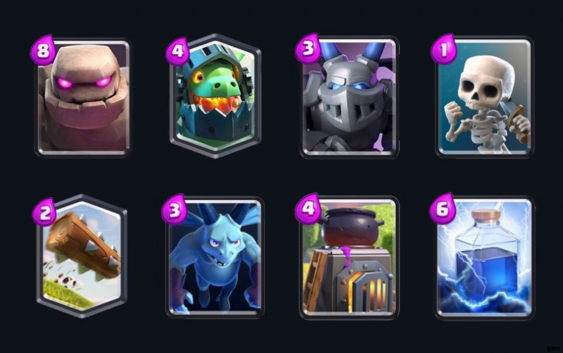 最高のクラッシュ・ロワイヤル アリーナ 10 デッキを始めましょう 最も重要なカードであるゴーレムをすぐに使用します。 非常に耐久性の高い戦車です ですが、エリクサー 8 ユニットが必要です .
