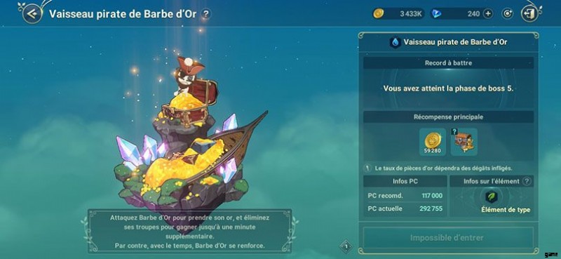 - 金ひげの海賊船 :この強化ダンジョンでは、金ひげを数回倒してレベルを上げ、より多くの報酬を獲得する必要があります。たとえば、フェーズ 5 では、約 60,000 ゴールドと、シャイニー コインまたはコケを入れることができるチェストを獲得します。このダンジョンは 1 日 1 回無料でクリアできます。