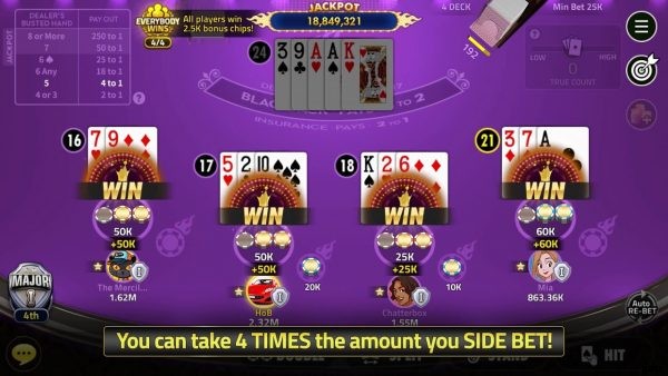 ゲームから得られる毎日の課題は、さらに多くの無料チップを獲得できる追加の楽しみ要素を提供します。初心者は、ゲーム内のブラックジャック トレーナーからも指導を受けます。初心者でも、単にゲームを上達させたいだけでも、アプリの統計ページから上達を監視できます。