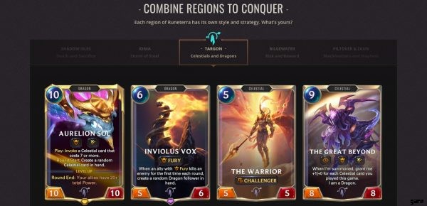 前述のように、ゲームには 8 つの地域があり、そこから開始できます。デッキは 40 枚のカードで構成され、各デッキには最大 6 人のチャンピオンが許可されます。