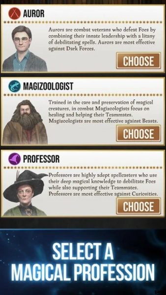 選択できる職業には、ハリー・ポッター、ミネルバ・マクゴナガル教授、ハグリッドがそれぞれ率いる闇祓い、教授、魔法動物学者が含まれます。各職業には、報酬で獲得した巻物を使用してレベルアップできる一連のスキルがあります。