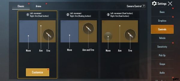 3. コントロール を選択します 電話機の右側にあるタブからオプションを選択します。 Classic のいずれかを選択するよう求められることに気付くでしょう。 またはアリーナ。 前者のオプションを選択し、[カスタマイズ] をクリックします。
