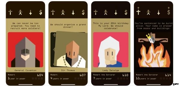 このゲームは非常に進歩していますが、「ワンライフオンリー」タイプのゲームの 1 つでもあります。失敗すると統治が終わり、新しいゲームを作らなければならなくなります。それは非常に挑戦的な管理カードゲームです. Reigns:Her Majesty という続編もあります。