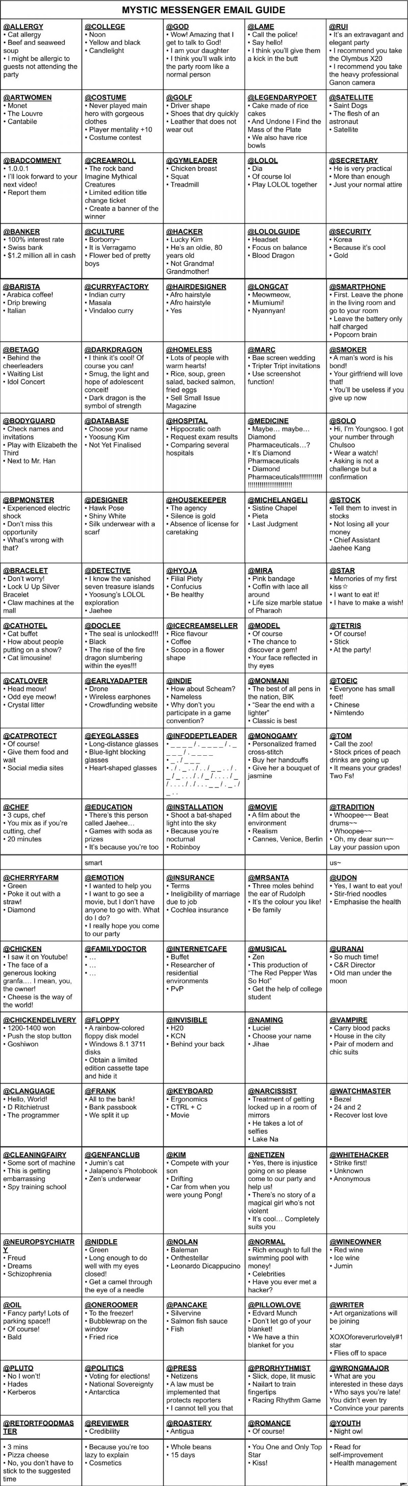 ほとんどの場合、RFA メンバーとの会話から回答を得ることができます。会話にはヒントが隠されているため、RFA メンバーがゲストについて言及するたびにメモを取るだけで済みます。これは、Mystic Messenger のメールに返信するときに役立ちます。これは、メールが少し複雑になる可能性があるためです。