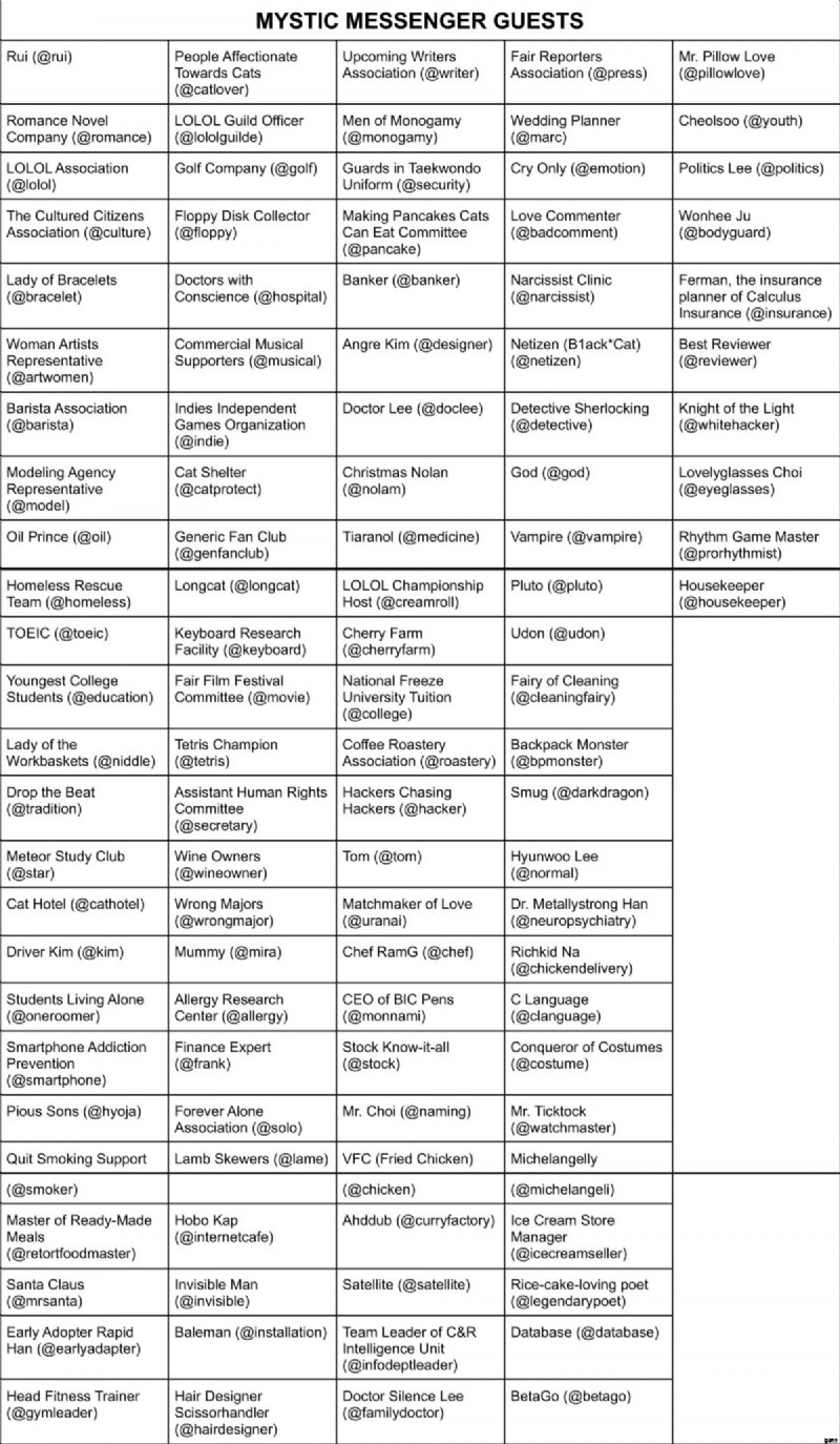 とはいえ、ゲームで遭遇する Mystic Messenger のゲストの簡単なリストは次のとおりです。