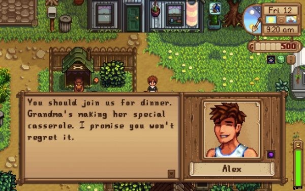 Alex lives near Pierre’s General Store. He usually hangs out at the beach or spa for his daily workouts, depending on the season. In terms of Stardew Valley gifts, Alex prefers a complete breakfast and Salmon dinner the most. His other favorite presents are below: