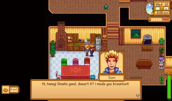 Sam lives south of town and works at JojaMart. Additionally, his favorite hangout spots are the Stardrop Saloon, beach, and woods, depending on the season.