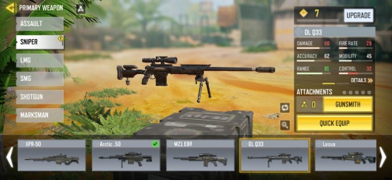 DL Q33 は、COD Mobile で最も強力な狙撃銃かもしれません。 Arctic .50 よりも優れたダメージと射程を備えています。その弾丸の貫通力は非常に優れており、1 発で 2 人の敵を倒すことができます。ただし、その発射速度、機動性、および制御はあまり印象的ではありません。直接対峙した場合、DL Q33 を使用しているプレイヤーは、SMG やアサルト ライフルを使用しているプレイヤーに対して何の役にも立ちません。 DL Q33 は非常に特殊な状況でのみうまく機能します。そのため、COD モバイルで最高の銃として王位を主張することは常に不十分です。