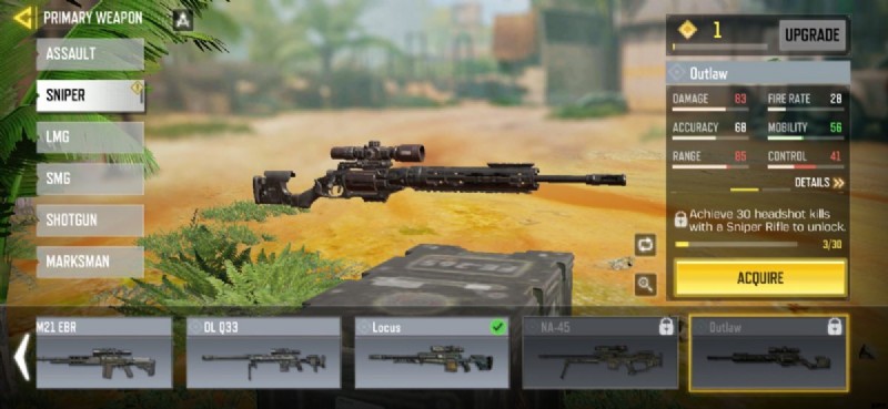 Outlaw は、Locus の次に COD Mobile で最高の狙撃銃です。ダメージと範囲に関しては、2つの間に大きな違いはありません。他のスナイパー ガンと同様に、非常に高いダメージ能力を備えていますが、発射速度はひどいものです。この銃を使用するときは、一発しか撃てないことを前提としているので、常に頭を狙ってください。 Outlaw の強力な垂直方向の反動を考えると、これを行うのは少し難しいかもしれませんが、練習すれば自然と間に合うはずです。