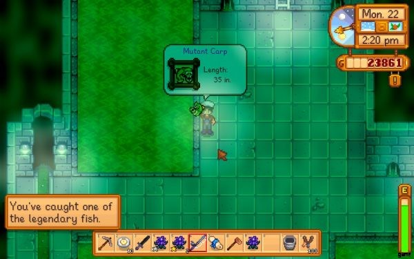 ミュータント コイは、下水道の汚水に潜んでいるどう猛なスターデュー バレーの伝説の魚です。その変種である放射性コイは、目が怒っているため、より怖いです。どちらの魚も恐ろしく見えますが、エネルギー ポイントとヘルス ポイント、または最大 2000G の追加のゲーム内マネーを得るために釣る価値はあります。