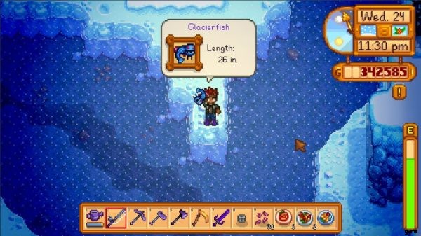 グレイシャーフィッシュを釣るには、釣りレベル 5 に到達し、アローヘッド島の南にある最も薄い崖の上に立ってください。イリジウム ロッドの釣り糸に餌を投げるか、崖から数ブロック離れた場所や泡立つ場所に向かってタックルします。大家族クエストを行っているときは、Glacierfish Jr に対して同じおびき寄せと捕獲の戦術を使用できます。