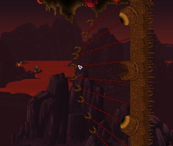 Wall of Flesh は画面の片側からあなたに近づき、手と口であなたを殺そうとします。ボスを簡単に倒すには、アリーナの端から端まで伸びる水平なプラットフォームを 1 つ用意する必要があります。ステージは、誤って落ちる可能性のある溶岩プールもカバーする必要があります.
