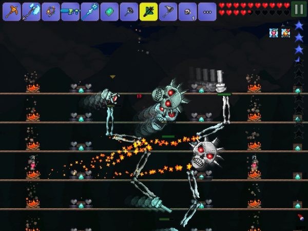 戦闘中、スケルトンは頭蓋骨の周りで手を振っています。あなたの動きを遅くし、重大なダメージを与える準備ができています.それを避けるには、事前に大きなアリーナを設計する必要があります。壁を切り開き、プラットフォームを追加します。手に巻き込まれると複数回ダメージを与える可能性があるため、戦闘中にヨーヨーを使用してください。手足がなくなったら、頭蓋骨をターゲットにして直接ダメージを与えます。