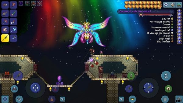 In the battle, you will notice that the Empress of Light has a broader attack range than Plantera. She will charge at you, disperse petal beams, and fire flower projectiles that can cover almost the entire screen. To evade and go to any part of the arena, you should build many platforms in advance.