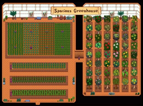 The Spacious Greenhouse, meanwhile, is the biggest of all for it features two rooms. The first can fit eight Iridium Sprinklers and more than 400 plants in one big and three small rectangular plots, while the second houses up to 48 trees.
