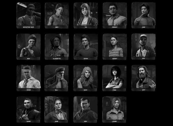 ゲームには 21 人の生存者がいますが、最初から全員が利用できるわけではありません。チュートリアル終了後は、ウィリアム・オーバーベック、メグ・トーマス、ドワイト・フェアフィールドのみが利用可能です。入手できるもう 1 つの無料キャラクターは、最初のスターターの儀式を達成した後にチームに加わるクローデット モレルです。その他のキャラクターは、無料チケット、ゲーム内バンドル、または「虹色の破片」または「オーリック セル」と呼ばれるゲーム内通貨を使用して個別に購入することで入手できます。
