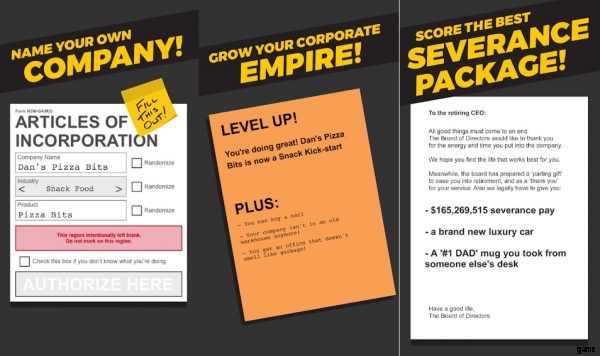 The game plays out as a hybrid management-social interaction game where you manage a company and your employees while firing out the ones you don’t want to keep on. Aside from that, you can set goals for your company as it slowly levels up and earns more and more. There is no continuing money count through the game though since your success is based on how big your retiring CEO severance package becomes!