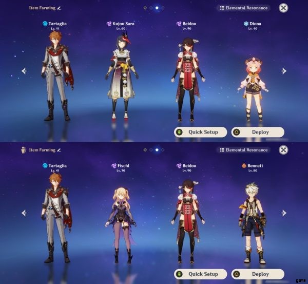 この構成では、Fischl と Beidou をオフフィールド DPS として、Kujou Sara を Burst Support として、Bennett と Diona を Full Support として構築してみてください。