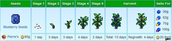 イチゴと同様に、ブルーベリーには多くの効果があります。種子から成熟までわずか 13 日間で成長するだけでなく、1 回の収穫で 3 つ以上のブルーベリーを収穫できる可能性もわずかにあります。また、わずか 4 日間で果実を再成長させます。通常の品質のブルーベリーはそれぞれ 50g で販売されています。これは、各植物が 1 つの種子に少なくとも 3 つ保証されているため、かなりの価格です。ピエールのブルーベリーの種はわずか80gで購入できます。保存瓶や樽があれば、ブルーベリーを手作りの製品に変えて、もっと高く売ることができます。