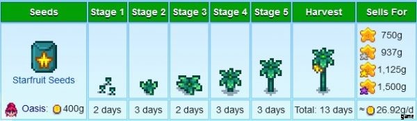 スターデュー バレーで最高の夏の作物であるスターフルーツは、種子から成熟するまでわずか 13 日で成長します。スターフルーツは、入手するためにオアシスにアクセスする必要がある別の植物です。そこに着くと、1粒400gで種を購入できますが、収穫後は簡単にコストを補うことができます. Starfruit はゲーム全体で 2 番目に高価な作物であり、通常の品質の品種でもなんと 750g で販売されています。