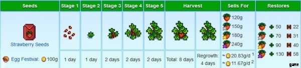 春に最適な通常の作物であるイチゴは、今シーズンで最も高価な作物です。これは、通常の品質のものだけで、1つ120gで販売されているためです.イチゴは、成長して成熟するのにわずか 8 日しかかかりません。彼らはまた、4日ごとに果実を再成長させ、複数の収穫を可能にします.これの唯一の欠点は、種メーカーからイチゴを使用するか、卵祭り中に 100g で購入することによってしか種を入手できないことです.