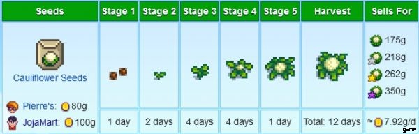 3 番目に高価な春の作物であるカリフラワーは、完全に収穫するのにわずか 12 日しかかかりません。前2作の春作に比べ、カリフラワーの種はピエールやJojaマートで手軽に購入できます。ただし、ピエールは Joja マートに比べて種を 20g 安く 80g で販売しています。カリフラワーの通常品質の頭は、それぞれ175gで販売されています.また、染色可能なシャツやベルトを作成するための仕立てにも使用できます.