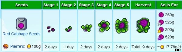春のカリフラワーと見た目が似ている赤キャベツは、夏の作物の中で 2 番目に高価です。通常品質の赤キャベツで1頭260gで販売されています。 2年目以降は通常の作物で、ピエールさんから100gで種を入手して植えることができます。各種子を収穫できるようになるまで、9 日間待つだけです。