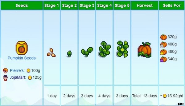 2 番目に高価な秋の作物であるカボチャは、1 回しか収穫できない従来型のものです。カボチャが種子から収穫可能な成熟まで成長するのに13日かかります.その成長はごく普通ですが、通常の品質のカボチャを 1 ピース 320g で販売することができます。種を育てるには、ピエールから 100g で、または Joja マートから 125g で種を購入できます。