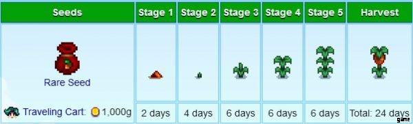 前述したように、スイート ジェム ベリーは Stardew Valley で販売できる最も高価な作物であり、通常の品質のものでも 1 個あたりなんと 3,000 グラムにもなります。ただし、スイート ジェム ベリーの種は見つけるのが非常に難しく、ゲーム内の名前は文字通り「レア シード」です。これらの種子は、24日で成長して収穫するのにほぼ1か月かかります.唯一入手できる場所は、600gから1000gの行商人のカートからです。ただし、カートが販売するすべての商品と同様に、これはすべて運の問題です。これらの種子は、秋や冬よりも春や夏に販売されている方が見つけやすいでしょう。