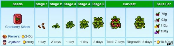 イチゴのように再成長し、急速に成熟するもう 1 つの作物であるクランベリーは、成熟して収穫可能になるまでに 7 日しかかかりません。その後、賞金を再成長させるには5日かかります。各ベリー房は 75g で販売できますが、収穫ごとに少なくとも 2 つの房が得られます。通常のタネはピエールで240g、Jojaマートで300gで購入できます。