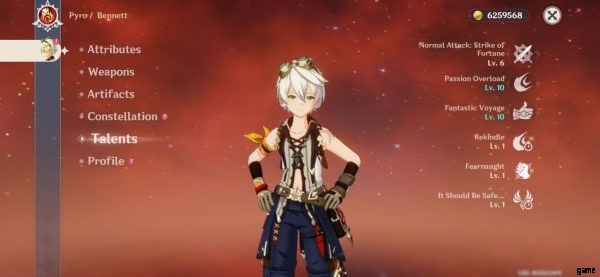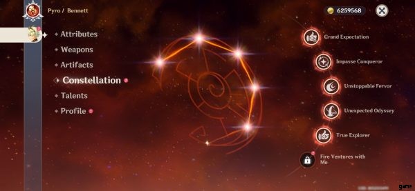 必要がない限り、ベネットの第 6 星座 (Fire Ventures with Me) をアクティブにしないでください。この星座は、ソード、ポールアーム、クレイモアのキャラクターがファンタスティック ボヤージュの半径内にいる場合、パイロを吹き込みます。キャラクターにパイロを吹き込みたい場合を除き、この星座のロックを解除しないでください。これにより、エレメンタルリアクションを実行できなくなります。彼の星座のロックを解除できるのは 5 つまでです。