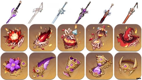 - クリムゾン ウィッチ オブ フレイム セットを完了するか、ATK%、エレメンタル マスター、パイロ DMG、クリティカル率/ダメージ、エネルギー リチャージに重点を置いたサンダーリング フューリー セットを完了する
