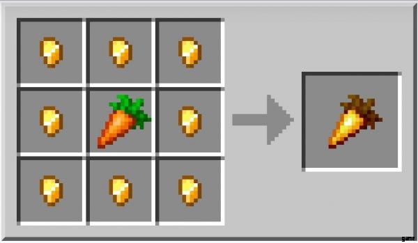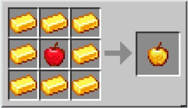 金のリンゴの作り方は、金のニンジンの作り方と同じです。ただし、グリッドの中央にニンジンを配置する代わりに、リンゴを配置します。さらに、金塊 8 個ではなく、金インゴット 8 個が必要です。