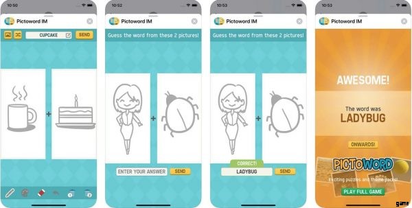 Another brain-teasing word iMessage game, Pictoword is a good iMessage game to have. Compared to the Scrabble-like Words for iMessage, Pictoword instead has players guess code words from the two pictures presented to them.