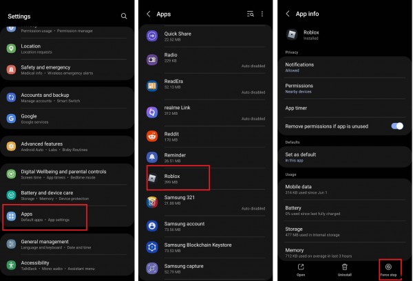 Roblox がロードされていないか、常にクラッシュしている場合、アプリを強制停止して再度開くことで簡単に解決できます。そうすることで、アプリが更新され、パフォーマンスを低下させる可能性のある小さな不具合が解消されます。